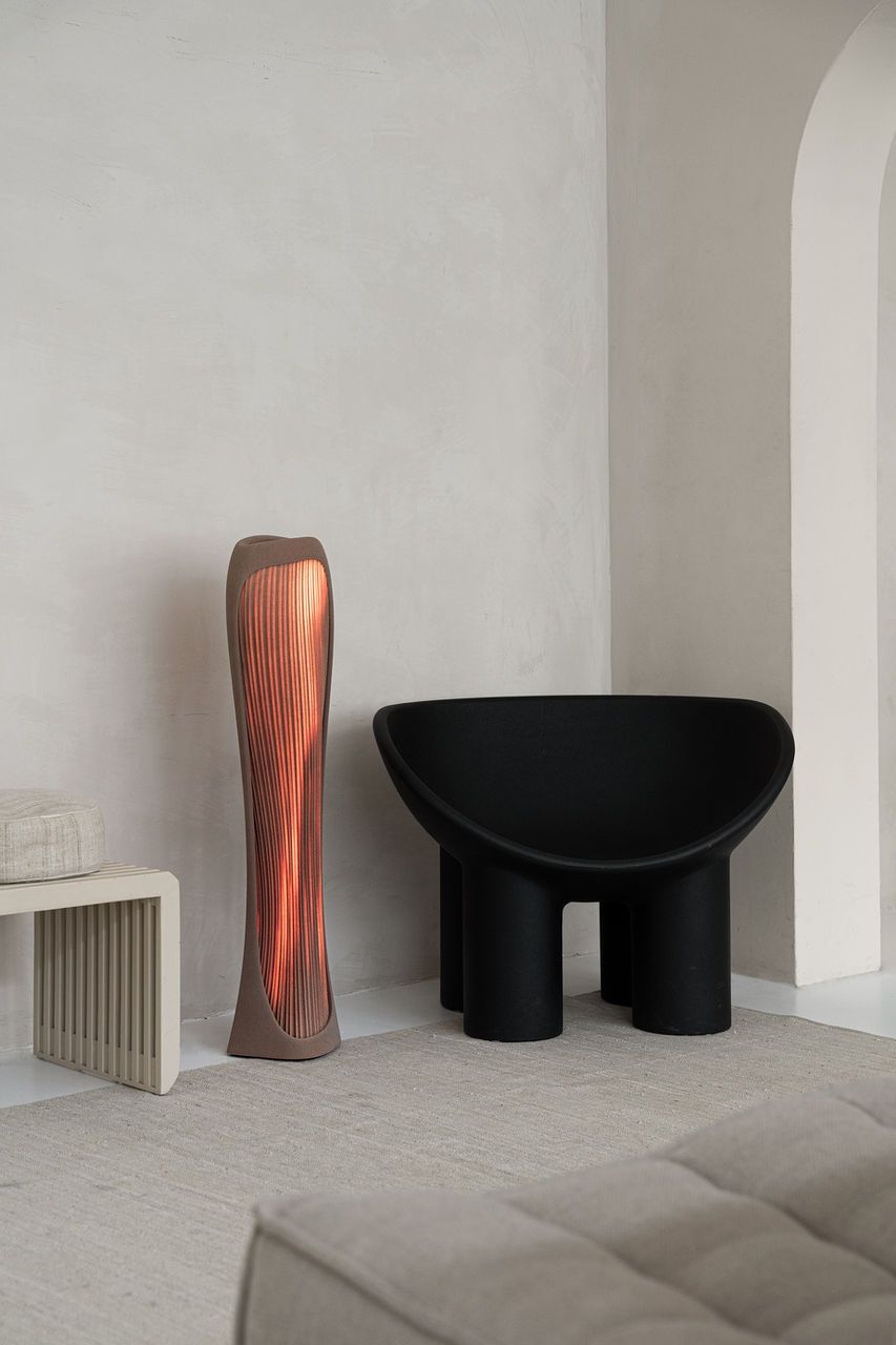 This lamp boasts a unique form language that mimics the organic shapes found in nature, resulting in a piece that is both elegant and contemporary. The internal light source emits a soft, ambient glow that diffuses through the sand material, creating a warm and inviting atmosphere. The Dune floor lamp is a functional work of art that is sure to impress, perfect for adding a touch of sophistication to any modern interior. With its sophisticated form and high-quality materials, this lamp is a true representation of our studio's commitment to artistic innovation and design excellence.